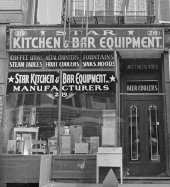 However the wording on the right panel doesn’t match the 1940 photo, instead saying, “Fountains, sinks, hoods.” I believe that the etched glass sign was changed since 1940. Prior to 2021, Street View presents an image in which the central panel etching was preserved; but that has since been lost since objkt.com has occupied the space. If you play around with the Street View “time machine” the entire storefront was covered by a vinyl awning sign for Chair Up, a furniture store.