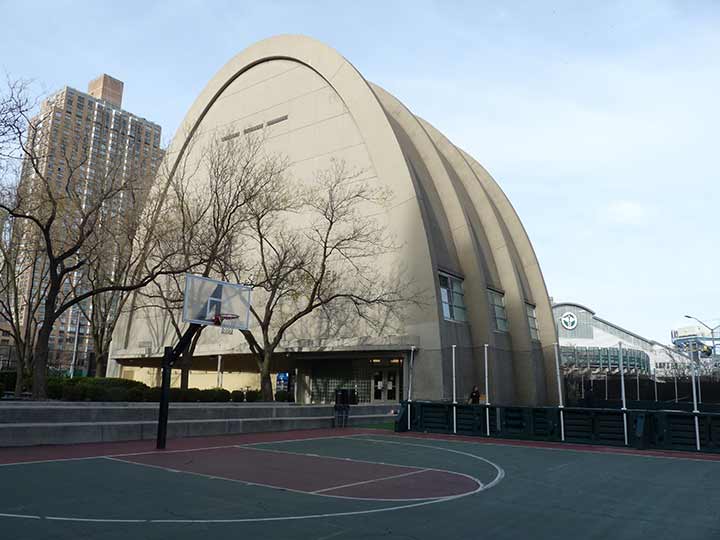 The Murphy Center was constructed from 1941 to 1944 as part of a large asphalt mixing plant designed by architects Ely Jacques Kahn and Robert Allan Jacobs, hence the name of the nearby center, Asphalt Green. Much of the asphalt used to pave NYC streets was produced here from 1914 to 1968. After that, the rest of the asphalt factory buildings were demolished and the playground built in its place.