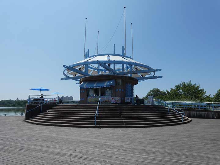 The Amphitheatre soldiered on for some decades after the Fair, but succumbed to deferred maintenance and was finally pickaxed to oblivion in the mid-1990s. Ten years after the final disappearance of the Aquacade, a pedestrian pavilion slowly took shape along Flushing Meadows’ Meadow Lake. The Aquacade was remembered by a pavement mosaic at the park’s main entrance on the walkway leading to the IRT subway; those mosaics were recently removed by Parks.