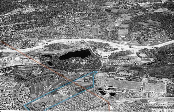 Looking at an aerial survey of LIJ from 1956, perhaps there was an anticipation that this hospital would expand in the coming decades. To its north is the highest point in Queens, the North Shore golf course which later had residential towers built on it. Across the city line in the Village of Lake Success was the Sperry gyroscope factory that served as a temporary headquarters of the United Nations from 1946 to 1952. Northern State Parkway was barely visible among the trees as it only had four lanes at the time. Parallel to it, Long Island Expressway appears under construction, spurring the suburbanization of Long Island.