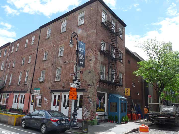 THIS building, #259 Front Street at Dover Street, as well as the two adjacent buildings on Dover, was constructed in 1808 for flour merchant David Lydig. He had gone into business on Peck Slip in 1789 and owned a fleet of Hudson River sloops that delivered flour to his South Street wharf. Bakers were attracted to the block with a handy flour merchant nearby. Anticipating the completion of the Erie Canal, which would enable flour to be delivered from western farmlands at a cheaper rate, he sold his sloops at a profit and retired.