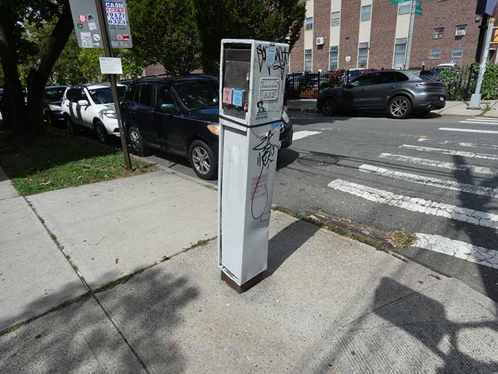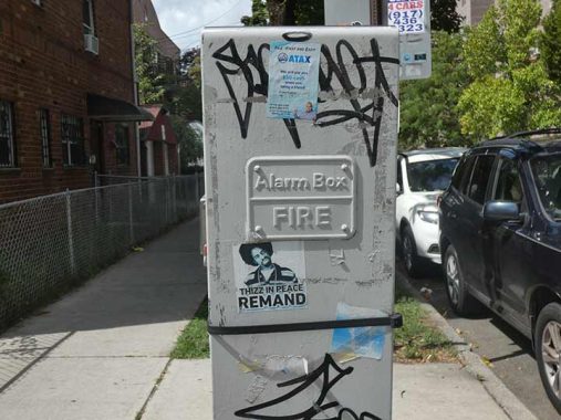 The new 1970s design never fully caught on. Most have a shiny metal exterior, aluminum or stainless steel. However, this one on Roosevelt Avenue in Flushing had been attacked by graffitists and was then painted over in gray. In most cases, fire alarms have been replaced by pressing the 911 buttons on your cell phones, but the city still dutifully maintains fire call boxes on every other corner, just in case.