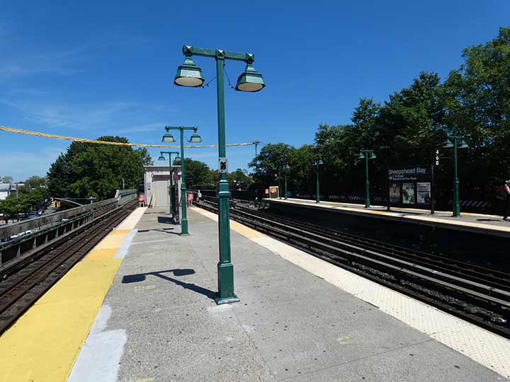 I am always heartened to see retro versions of original BMT hooded platform lamps, and there’s a batch at the Sheepshead Bay Road station on the Q train. When first installed in the 1910s these type of platform lamps used incandescent bulbs. In recent decades, modern versions originally using sodium lights were installed during station renovations. Unfortunately in the conversion to LED lamps, modern LED fixtures have been crudely plopped on the retro poles, as has occurred at Queensboro Plaza or Court Square, both on the #7 train.