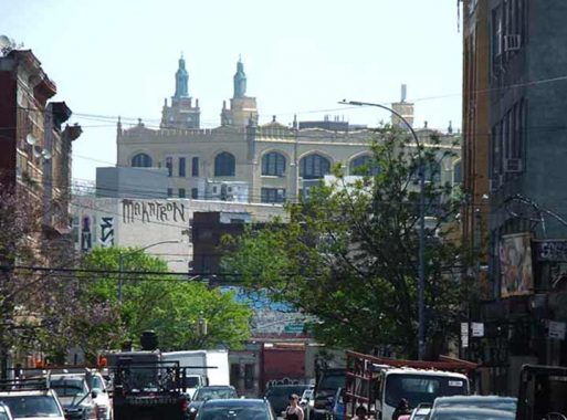 I have a new camera with an improved zoom. Looking east on Thames Street from Morgan, I noticed a pair of structures at the extreme horizon and zoomed in. The building in the foreground is PS 162 at St. Nicholas and Willoughby Avenues, and behind it are the towers of St. Aloysius Church, Onderdonk Avenue at Stockholm Street, visible from across the creek in Maspeth.