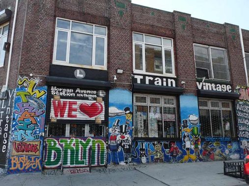 Though the much smaller in area Welling Court in Long Island City gives Bushwick a run for its money, Bushwick has become NYC’s capital of ingenious and colorful “street art” that is much superior than the usual spray can scrawlings. Many of the artworks are sponsored by an organization called the Bushwick Collective, founded by Bushwicker Joe Ficalora. There is a concentration of artworks at Wyckoff Avenue and Troutman Street, about a mile away from this subway exit at Bushwick and Montrose Avenues.