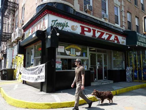 And the signs just keep on’ comin’! Like at Tony’s (& Orazio’s) Pizza, corner Knickerbocker and DeKalb Avenues. I like extended-letter fonts, and “pizza” is a short word, so it’s extended here. May Italian eateries have signs in red, white and green, Italian flag colors. According to its website it has been in business since 1969.