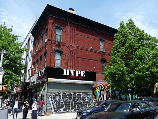 #92-96 Knickerbocker Avenue, NW corner of Thames, is another one of the area’s many massive brick, many-windowed buildings that was probably used for manufacturing as its original purpose but now is populated by many small businesses and perhaps some artists’ lofts, that include Knickerbocker BBQ Bar, Stems Florist and Standard Grooming.