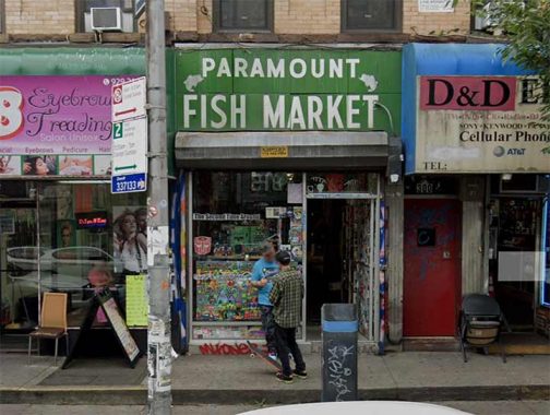 How did I miss this? I did. In any case, Street View has it, a grand old sign for Paramount Fish Market, Knickerbocker south of Suydam. There hasn’t been a fish market for a long time. When thrift shop Second Time Around moved in in 2011, they first installed an awning sign, then uncovered the old sign, and left it up ironically. The Street View is timestamped 2024, and Yelp reports the location has closed, so perhaps the sign has been re-covered already.