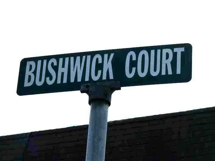 Prosaically-named Bushwick Court, Bushwick Avenue opposite Moore Street, is a relatively new addition to East Williamsburg, with attached homes featuring small “eyelet” windows on the 2nd floor. The court isn’t mapped by The NYC Department of Transportation, hence the nonstandard street sign.
