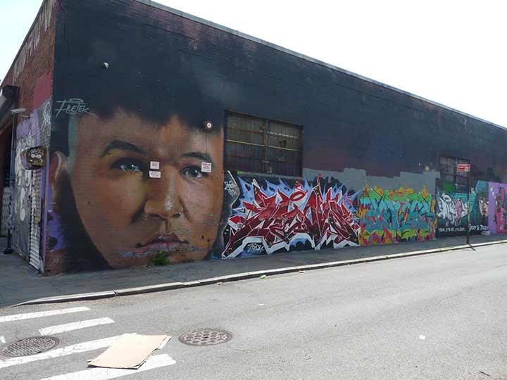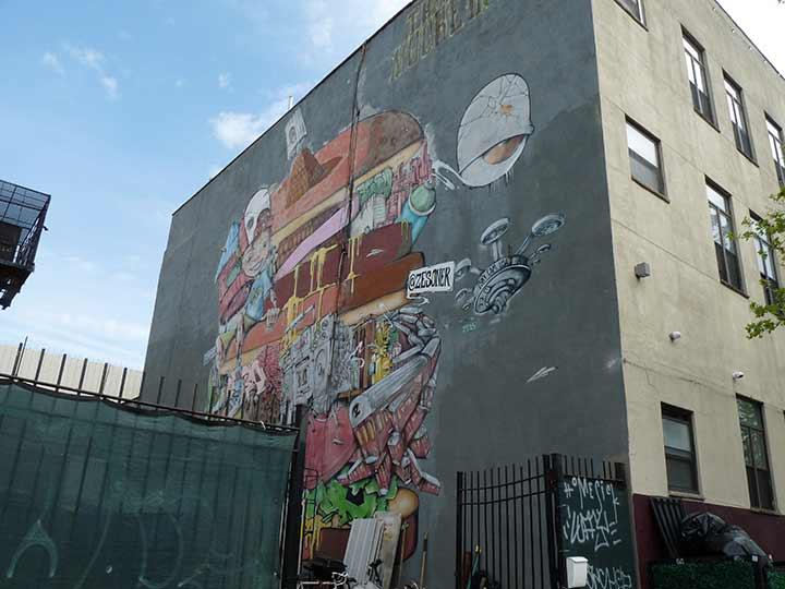 Though the much smaller in area Welling Court in Long Island City gives Bushwick a run for its money, Bushwick has become NYC’s capital of ingenious and colorful “street art” that is much superior than the usual spray can scrawlings. Many of the artworks are sponsored by an organization called the Bushwick Collective, founded by Bushwicker Joe Ficalora. There is a concentration of artworks at Wyckoff Avenue and Troutman Street, about a mile away from this subway exit at Bushwick and Montrose Avenues.