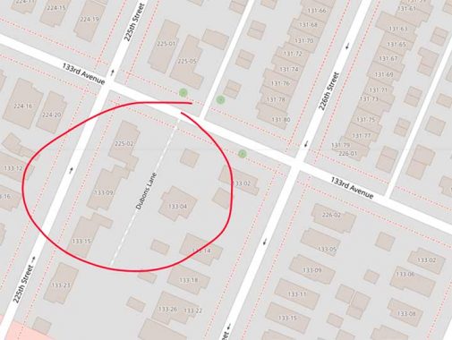 On 133rd Avenue between 225th and 226th Streets, Open Street Map has a “Dubons Lane.” Google Street Maps doesn’t show it, and Street View didn’t photograph that part of 133rd. However, if you look at the aerial view, you can pick out a slanted dirt path I have helpfully circled in red. Additionally, 133-10 226th Street is set way back from 226th Street and may have been built on the alley.