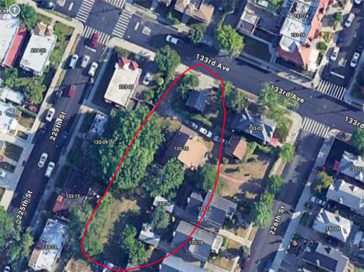 On 133rd Avenue between 225th and 226th Streets, Open Street Map has a “Dubons Lane.” Google Street Maps doesn’t show it, and Street View didn’t photograph that part of 133rd. However, if you look at the aerial view, you can pick out a slanted dirt path I have helpfully circled in red. Additionally, 133-10 226th Street is set way back from 226th Street and may have been built on the alley.