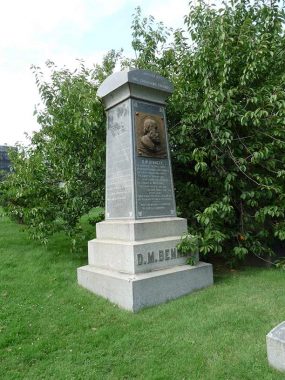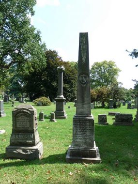 DeRobigne Bennett (1818-1882), preceded Richard Dawkins and Madalyn Murray O’Hair as perhaps the most prominent anti-religionist in the public imagination, publishing The Truthseeker as well as several books describing his anti-church leanings. After his death, the Pittsburgh Daily Post, learning that several of his writings were to appear on the shaft marking his plot in Green-Wood, mounted a public campaign against it, to no avail. The monument also is decorated with a quill pen laying atop a sword.