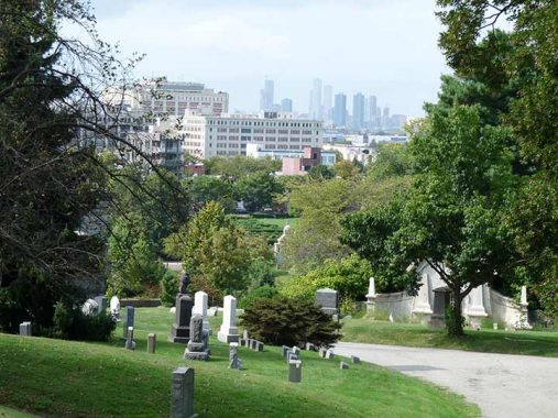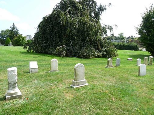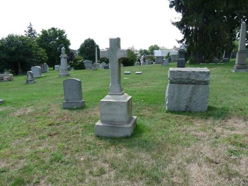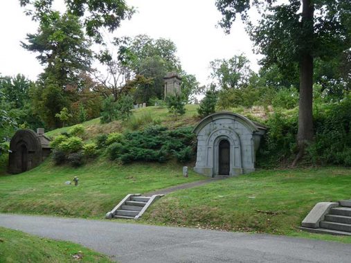 Adlenia M. Mortan Gordon’s tomb is located on a hillside. In the background we can see the gravesite of a famed inventor and painter.