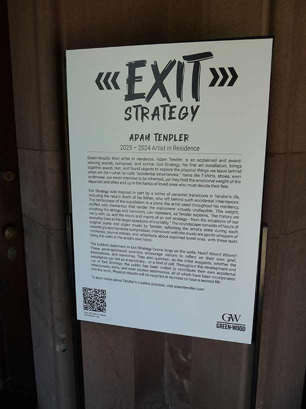 Exit Strategy is a site specific installation in Green-Wood’s Fort Hamilton Gatehouse created by the Cemetery’s 2023-2024 artist in residence, Adam Tendler. Interrogating the complex relationship between grief and personal identity, Tendler creates an immersive environment that meditates on the ways we attach ourselves to memories and physical objects, and the possibilities for letting them go. Layering music, text, visuals, and found objects, this semi-autobiographical work includes notes, voice memos, and personal objects sourced from the local Green-Wood community. At the conclusion of the installation, the accumulated items will be ritualistically discarded as part of a closing ceremony. [Green-Wood Cemetery]