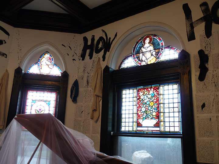 It’s an interesting concept in theory but frankly I was appalled at the presentation, which looked like some of the neighborhood youth had tagged the walls with spray paint. It was incongruous combined with the exquisite stained glass windows.
