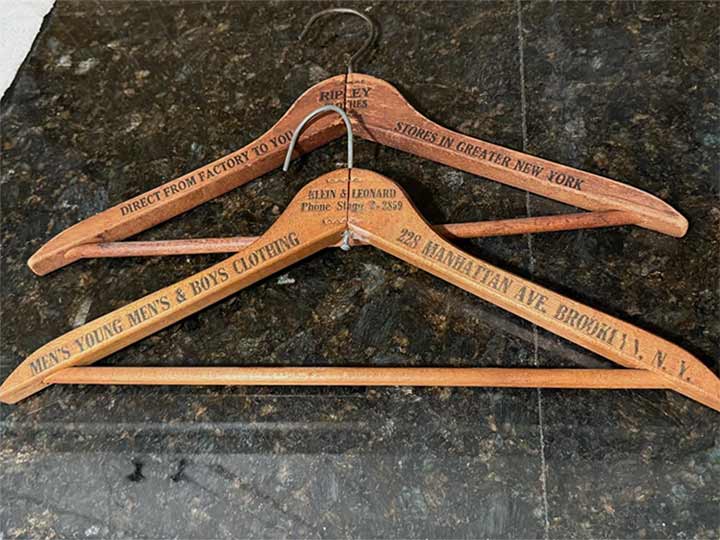 YOU can learn a lot from coat hangers…wood ones, at least. Newtown Historical Society president, Queen of Queens, Forgotten NY contributor and editor of Juniper Park Civic Association’s Juniper Berry Christina Wilkinson presented this pair of wood coat hangers distributed by Klein & Leonard, #228 Manhattan Avenue in Williamsburg, between Maujer and Grand Streets.