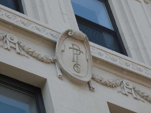 A mystery remains. Was National City Bank the first tenant, or did it give way to a company labeled, in this masonry shield, as PT & Co, or TP & Co.? I don’t know the company, or what order the letters should appear.