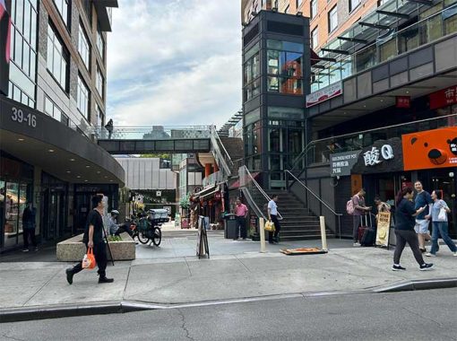 This alley was developed in 2015 as One Fulton Square. There were many streets named for Fulton across Queens prior to their numerization, but none in this immediate area. Other examples of traditional East Asian architecture include the Chinese Scholar’s Garden at Snug Harbor, Astor Chinese Garden Court at the Metropolitan Museum, and the Korean Buddhist temple on 32nd Avenue.