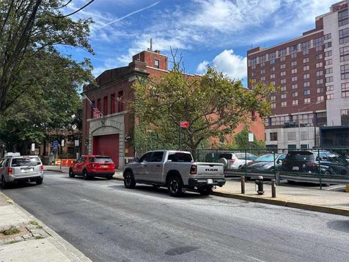 Considering the tight streets of downtown Flushing, it doesn’t appear easy for FDNY EMS Battalion 52 to get there quickly. This building originally functioned as Engine Co. 272, Hook & Ladder Co. 129, which moved to a firehouse on Union Street near Roosevelt Avenue in 1974. The former firehouse here stands in a municipal parking lot that was cleared around it.