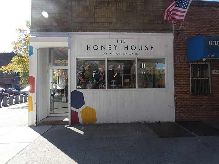 I was attracted to the Honey House sidewalk sign at 23rd Avenue and 35th Street, directly below the elephantine iron trestle taking trains to and from the Hell Gate Bridge. It’s in near-Futura, the 20th Century’s go-to sanserif font before Helvetica arrived in the late 1950s. (Serifs are the little lines at the top and bottom of some printed fonts; sanserif fonts don’t have them.) It was developed by German typographer Paul Renner in 1927.