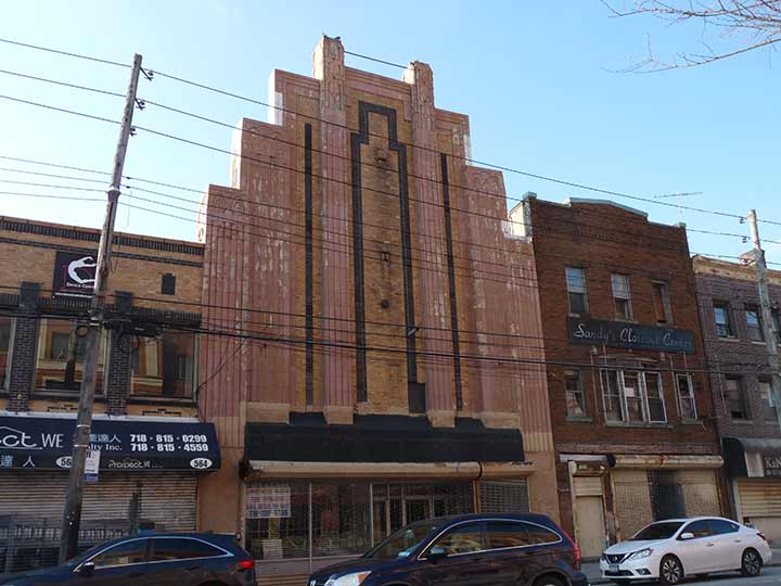 PARAMOUNT Theatre, at 560 Bay Street near Prospect, is now likely Staten Island’s premier ‘ghost theater’ now that the St. George has been restored and reactivated. It was designed by architects Rapp and Rapp with a contrasting orange brick façade, opening in 1930 with a capacity of 2500 seats and two Wurlitzer pipe organs, an extravagant feature during the Depression. In its latter days, it became an adult movie venue in the 1970s, and later, a rock club; the British band XTC played here in 1982, shortly before it gave up on public performances altogether, as well as the Ramones, B-52’s (who are still touring), Squeeze. The interior has been gutted, but its beautiful outsides are still in view.