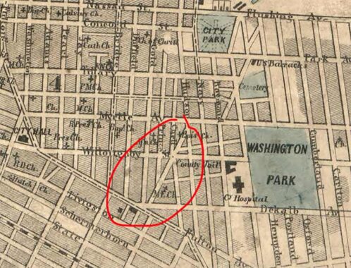 On the earliest detailed map of Downtown I have, the 1852 Dripps atlas of Brooklyn and Queens, the slanted ghost of Fleet Street is in place, though it wasn’t yet known by that name. I don’t know why Downtown had a few slanted streets like this, but they may have led to markets or other gathering places.
