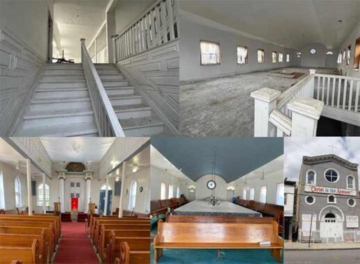 I was not able to enter the shuttered former synagogue, but fortunately there are plenty of photos available on Zillow and MLS showing the sanctuary virtually unchanged since its last Jewish service. The women’s balcony wraps around the sanctuary where men sat. One can imagine immigrant crowds from Eastern Europe walking up these creaking wooden steps in the first 63 years of this building.