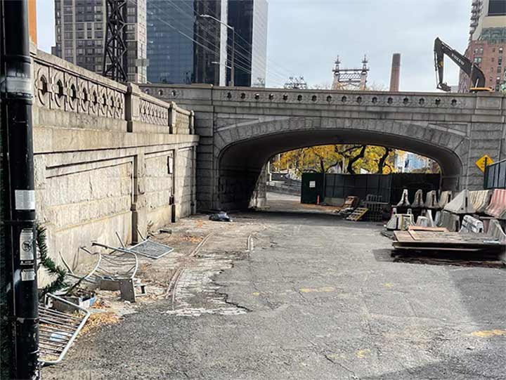 FORGOTTEN FAN Jonathan Rickard passes along what appear to be exposed trolley tracks, and a bit of Belgian block paving, in a storage area at the remaining 1909 vintage lamppost on East 59th Street just east of 2nd Avenue. The ornate fencing and arch seen in the background carries one of the bridge’s approach ramps. I really should make a trip there as there are some interesting vintage structures to be found in the area, but the impossible traffic always puts me off.