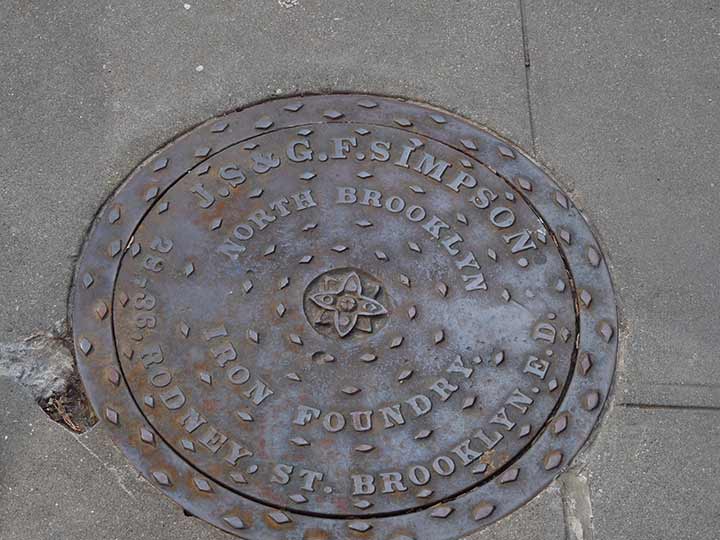 Forgive me. My slight case of OCD often compels me to try as much as possible to center my subject in the shot but for some reason I couldn’t do it this time. Nevertheless you can make out that the coal chute cover was made by the J.S. and G.F. Simpson North Brooklyn Iron Foundry, 28-36 Rodney Street in Williamsburg, Brooklyn, between Wythe and Kent Avenues.