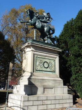 At Park Circle, the striking visual impact of the twin Horse Tamers sculptures by Frederick MacMonnies greets visitors on each side of the drive leading into the park from the Circle. The sculptures, dedicated in 1899, were originally called “The Triumph of Mind over Brute Force.” Some reviewers compare it to Guillaume Coustou’s Horses of Marly in the Place del la Concorde in Paris. Note that the tamer is using a curved dagger, known as a quint, to subdue the steeds.