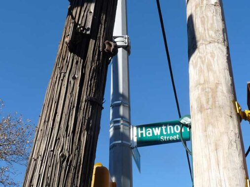 Why get a photo of a telephone pole at New York Avenue and Hawthorne Street? If you look carefully you can see a pair of very rusty brackets that used to hold street signs, likely of the “humpbacked” variety that also showed the cross street.