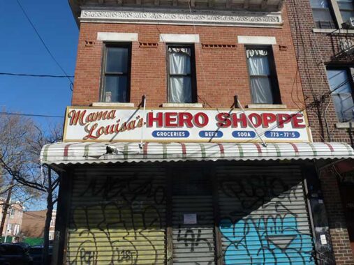 A vintage plastic letter sign for Mama Louisa’s Hero Shoppe, closed of course on Thanksgiving, at Rutland Road and New York Avenue. Reviewers note the artichoke parm is the sandwich to order.