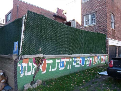 The painted sign south of President Street alongside Kingston Avenue – The Hebrew translation is: Micha 4:4 “they will sit, each many under his vine and under his fig tree”