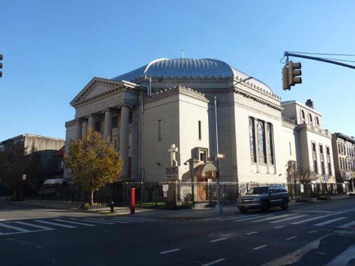 Across from the southeast corner of Brower Park is the former Shaari Zedek (Gates of Righteousness) synagogue, completed in 1925 on the site of Brower’s mansion. Designed for a wealthy community, this classical revival structure included classrooms, a gymnasium, bowling alley, auditorium, and a pipe organ. At its dedication, its lights were turned on remotely by President Calvin Coolidge from Washington. With white flight in the 1960s and an uptick in crime, the congregation declined. In 1969 it was sold to an African-American congregation, the First Church of God in Christ of Brooklyn. Whatever happens in demographics, the building and its surrounding blocks are landmarked, securing its future on the streetscape.