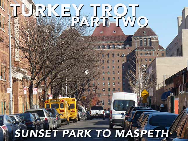 THURSDAY, November 23, 2017, Thanksgiving Day, dawned sunny and bright. I usually have been at one cousin or the other’s Thanksgiving extravaganza but that year, they were doing it on the weekend, thus I was at loose ends. Perfect photography conditions, though, if I didn’t mind the harsh shadows. So I hatched a plan. Why not link two neighborhoods that have nothing to do with one another with a walk? I arrived at Sunset Park to Maspeth, which would take me through Borough Park, Lefferts Gardens, Crown Heights, Bedford-Stuyvesant, Bushwick, Ridgewood and Maspeth. I walked from the light of day to the dark of night, nonstop (maybe a bathroom break, I forget). To my surprise it totaled only 12-13 miles; I know people who have walked triple that in one walk. It’s 8 years later, and at age 68, my back as well as other parts will no longer permit a nonstop walk like that. It’s not my longest: that was the full length of Metropolitan Avenue, Williamsburg to Jamaica, in May 2015.