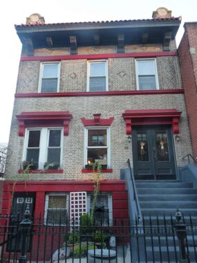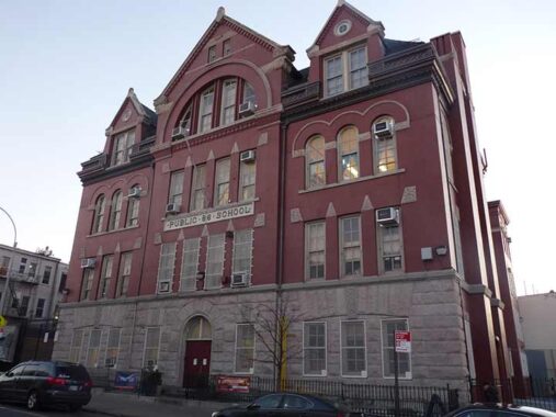 At Harman Street and Irving Avenue is a second James W. Naughton schools masterpiece, PS 88. It is a Romanesque Revival building completed in 1893. Naughton served as Superintendent of Buildings in the City of Brooklyn from 1874-1876, and became Superintendent of Buildings of Brooklyn’s Board of Education from 1879 until his death in 1898. He also designed Brooklyn’s Boys High School and Girls’ High School. All school buildings constructed in Brooklyn during that period were designed by Naughton.