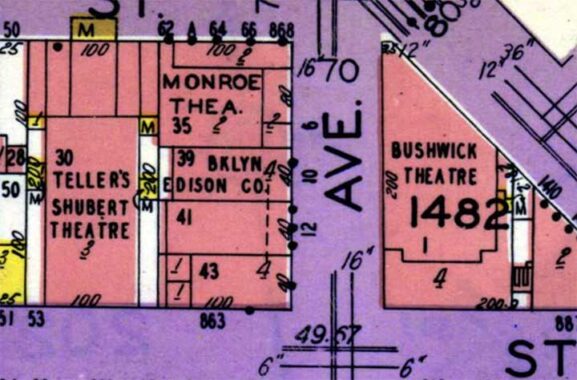 There were once three theaters on one block here: the massive Bushwick, seen in Part Three, as well as Teller’s Shubert Theatre on Madison and the Monroe Theatre at #4 Howard. What killed so many of NYC’s theaters? Television. This was once a lively entertainment hotbed that is utterly forgotten now.