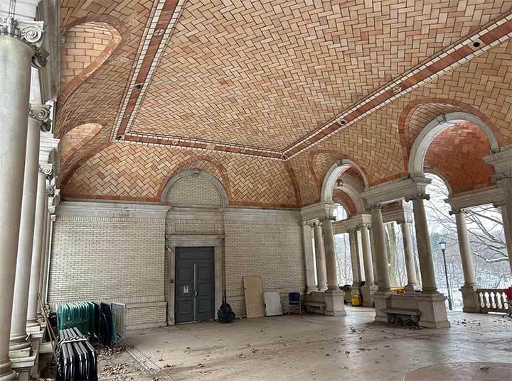 The ceiling of the loggia at the Tennis House has interlocking tiles by Rafael Guastavino, whose works can also be seen at the Great Hall at Ellis Island, underneath the Queensboro Bridge, and the Elephant House at Bronx Zoo, among other locations. I don’t believe that this space was ever used for a tennis game. Urban Archive has a map of his tile installations, but forgot to include this one.