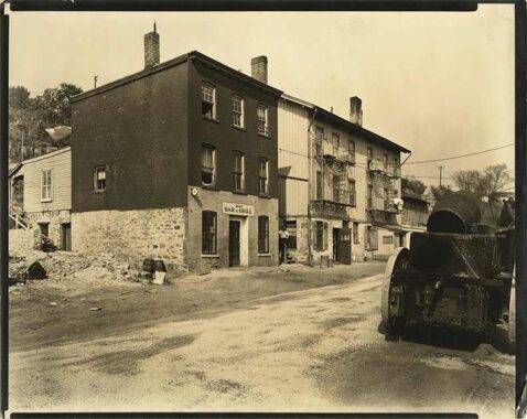 Abbott chose to shoot these three 3-story buildings on Ewen Avenue, likely the same day as the country store photo. One of the houses is anchored by a bar and grill, and two wood barrels can be seen in the alley beside it. A hill to the rear probably separates the street from Marble Hill, the only neighborhood in Manhattan on the mainland. Ewen Avenue remains a dirt road, but the truck at right could be an asphalt paver.