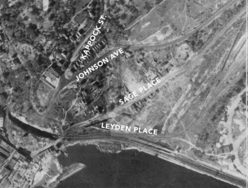 Which mapmaker was correct? In this 1924 aerial survey, Hagstrom may have been more on the money. It shows a triangle street layout, as does Hagstrom. I forgot to identify Ewen Street here, but it’s that brighter streak just east of Leyden. There are some scattered houses along Sage, and one of them may have been our country store.