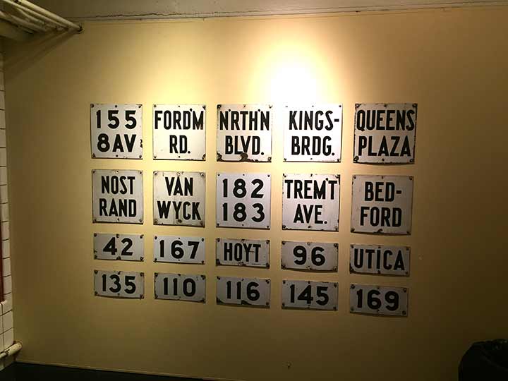 ALTHOUGH I am a loyal (dues-paying) member of the NYC Transit Museum on Schermerhorn Street, I have not been able to visit since January 2020, just before the pandemic. The museum has exhibited a fairly comprehensive selection of subway signage throughout the years. I’m fascinated by the square signs that were employed on subway columns. Most of these, before the 1980s, were white enamel signs with black lettering in a font designed specifically for the Transit Authority (I have not seen it elsewhere).