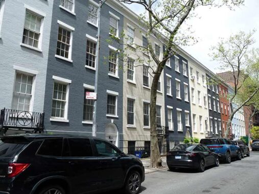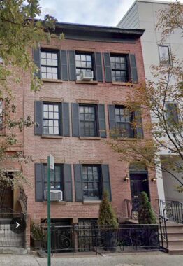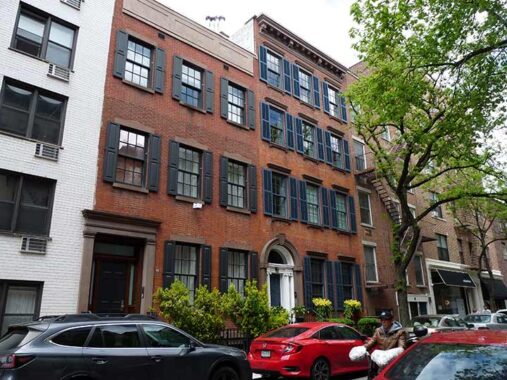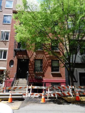 It’s a good thing I got this photo of #114 (left) and #116 Sullivan, since the owners have requested that Google Street View place its Blur of Anonymity in front of it. Both are protected by the Landmarks Preservation Commission as part of the Sullivan-Thompson Historic District, and #116 has been awarded a Landmark all its own as early as 1970. #114 is a “three-story Federal row house was built in 1832 for Charles Starr, a prosperous bookbinder and real estate developer of seven houses in this former row on Sullivan Street. The building was constructed of Flemish-bond brick with brownstone trim. The building is known to have had a slate pitched roof prior to being raised from two to three stories with running bond brick in 1898.”