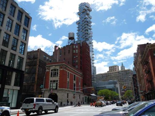 I couldn’t resist stepping back a bit and getting the firehouse in the same shot as 56 Leonard, known to many as the Jenga Building. Few can afford an apartment in it.