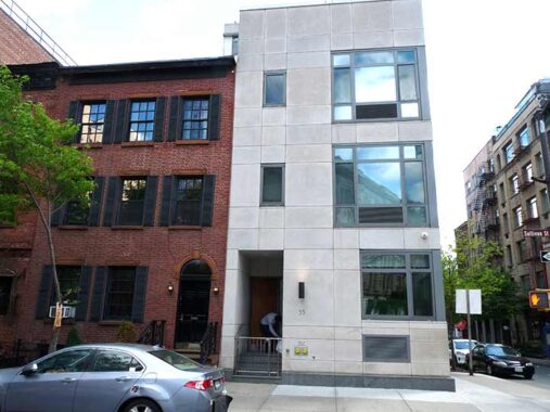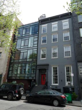 Once again, a contrast in residential building styles through the centuries, with #181 Sullivan, converted in 2006 by ADG Architecture and Design in the site of what was once the Sullivan Street Playhouse (longtime home of “The Fantasticks”) (earlier speakeasy Jimmy Kelly’s), and #179 Sullivan, built in 1834 and enlarged to its present size in 1879 on what was once called Varick Place. We’re sitting in the South Village Historic District, so how did #181 get such a radical alteration? The reason is simple. The historic district wasn’t awarded until 2013.