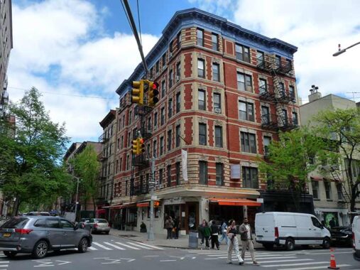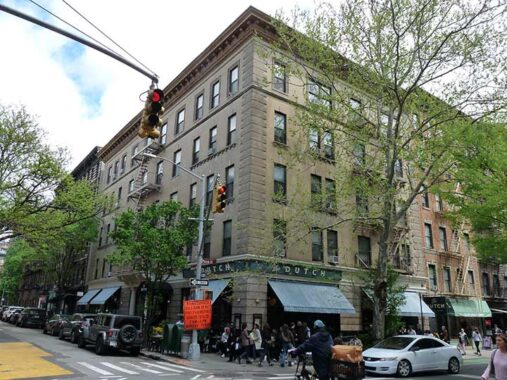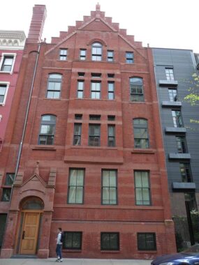 The huge, Beaux Arts Mills House No. 1 looks somewhat out of place on Bleecker Street, filling the south side of the block between Sullivan and Thompson Streets. As ornate as it is, it was built in 1892 to provide housing for the destitute. Ernest Flagg, who built Bay Ridge’s Flagg Court and a vast estate on Staten Island, was one of the architects. The apartments descended into decrepitude before the building was converted to more upscale housing in 1976.