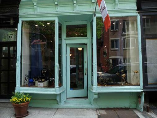 Sullivan, like other N-S streets in SoHo, has a lively storefront scene. Atelier d’Emotion (“Emotion Workshop”), #137 Sullivan, sells handcrafted jewelry as well as objets d’art and perfumes. The building “was designed by architects Horenburger & Straub and built in 1904 for Isaac Grossman and Charles Michael, then president and secretary of the Peto Realty Co.”