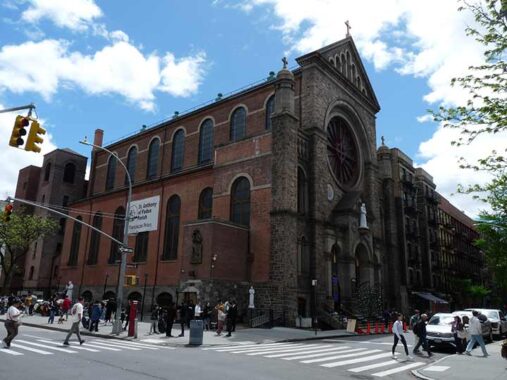 St. Anthony of Padua Church, 155 Sullivan Street, was dedicated in 1888 and originally couldn’t be seen from Houston Street, as it was widened in the 1930s for the IND subway and properties on the south side of the street were condemned and torn down. The church, founded in 1859, was originally located a couple of doors south at #149 Sullivan before the present church went up. According to the New York City Chapter of The American Guild of Organists it was the first parish in the United States created to serve the growing number of Italian Catholic immigrants. Street View shows you better detail; once again because of sun angle, I was unable to get non-glary photos.