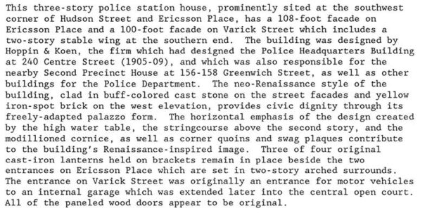 I seem to recall the 1912 NYPD 1st Precinct (originally 4th Precinct building (architects Hoppin & Koen) at Varick Street and Ericson Place still being used as a stable, but I could be wrong. From Landmarks Preservation Commission Tribeca West report: