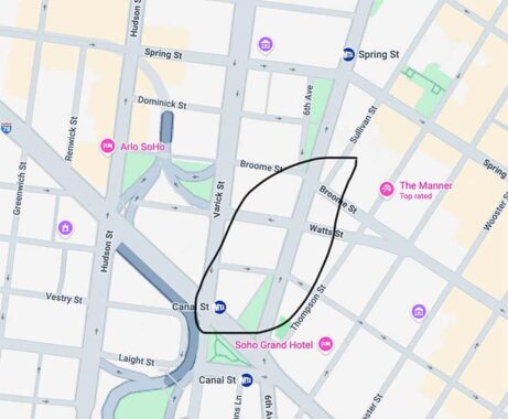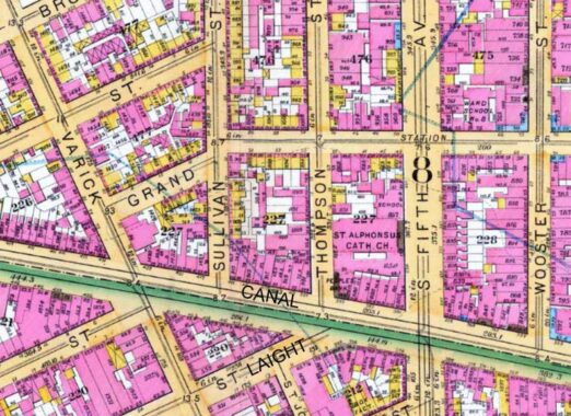 The map of the area has been quite different since then, as Sullivan is now open to traffic only as far south as Broome Street. If you look carefully at the 2025 map, you see a thin line where Sullivan used to be, and that portion of Sullivan is still there, though it’s been open only to pedestrians for decades. The lot east of Varick and north of Canal has been empty for years, but the city is reconstructing the Canal Street Pumping Station in it.